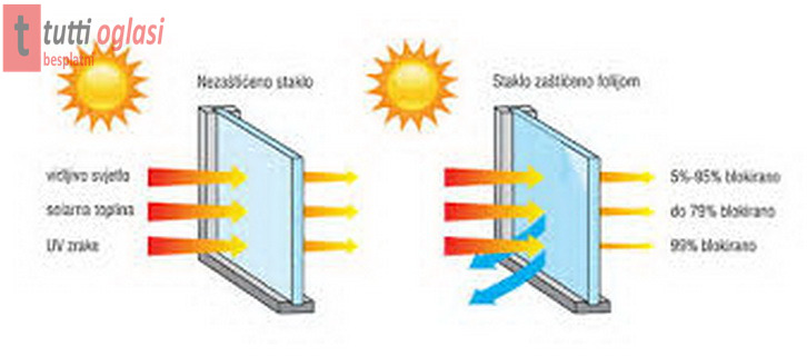 Folije za stakla, zastita od sunca, sa efektom „silver-ogledalo", omogucava zastitu privatnosti,a ujedno stiti od sunca i smanjuje temperaturu u prostoru do 12C,a pritom pruza totalnu UV zastitu.